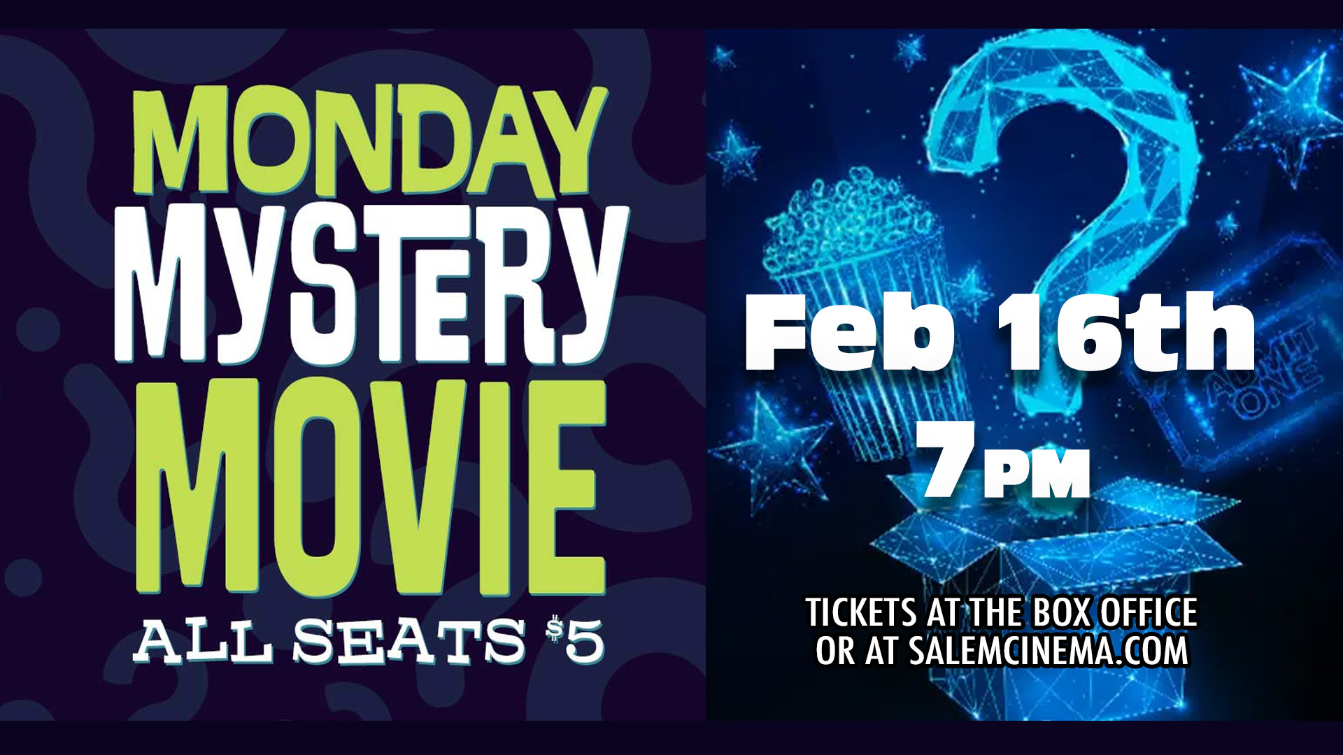 Early Screenings of New Movies for only $5! In the mood for mystery? Salem Cinema's got you covered with a Monday Mystery Movie. Join us for early screenings of new movies but here’s the catch – we’re not allowed to tell you what the Mystery Movie is. The only way to find out for sure is to be in the theater at 7PM!SurprisePT1H43MR2026-02-16Monday Mystery Movie"Monday Mystery Movie"Showtimes