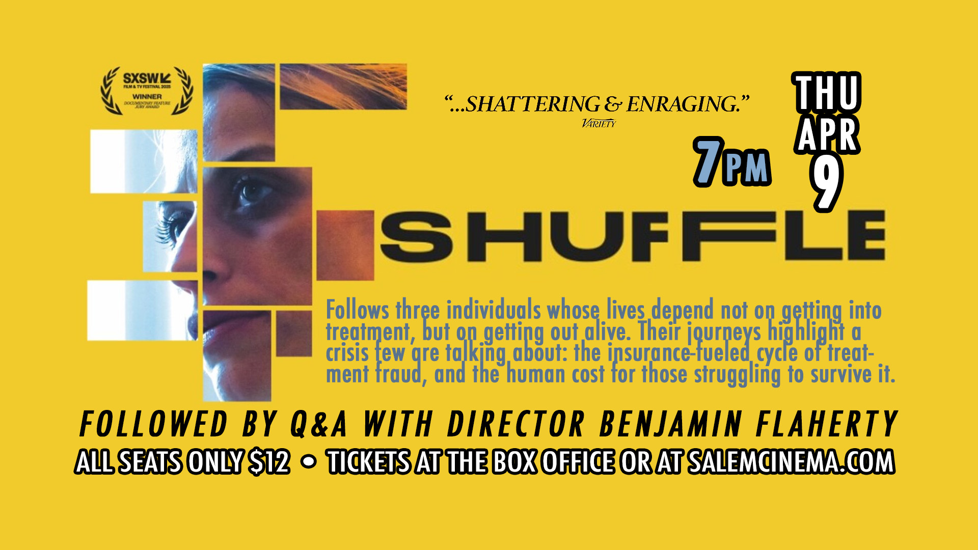 In the wake of the opioid epidemic, insurance companies were now required to cover addiction and mental health treatment at the same reimbursement rate as other medical conditions, but without any of the regulations, a move that effectively monetized the 40 million Americans struggling with these issues. Shot over the course of three years, Shuffle follows three individuals trapped by the insurance-fueled cycle of treatment fraud spreading across the country. whose future depend not on getting into treatment, but on getting out alive. A journey of discovery and transformation, these personal stories provide the framework for a more public investigation with the help of an FBI informant, an insurance analyst and the former Executive Director of a Philadelphia-based treatment facility shuttered for fraud, Shuffle unravels a web of public policy and private interest preying on a desperate population for the sake of profit.DocumentaryPT1H23MNR2026-04-09Benjamin Flaherty